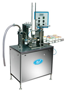 Фасовщик - полуавтомат жидких и пастообразных пищевых продуктов в пластмасcовые стаканчики с запечатыванием алюминиевой фольгой.
